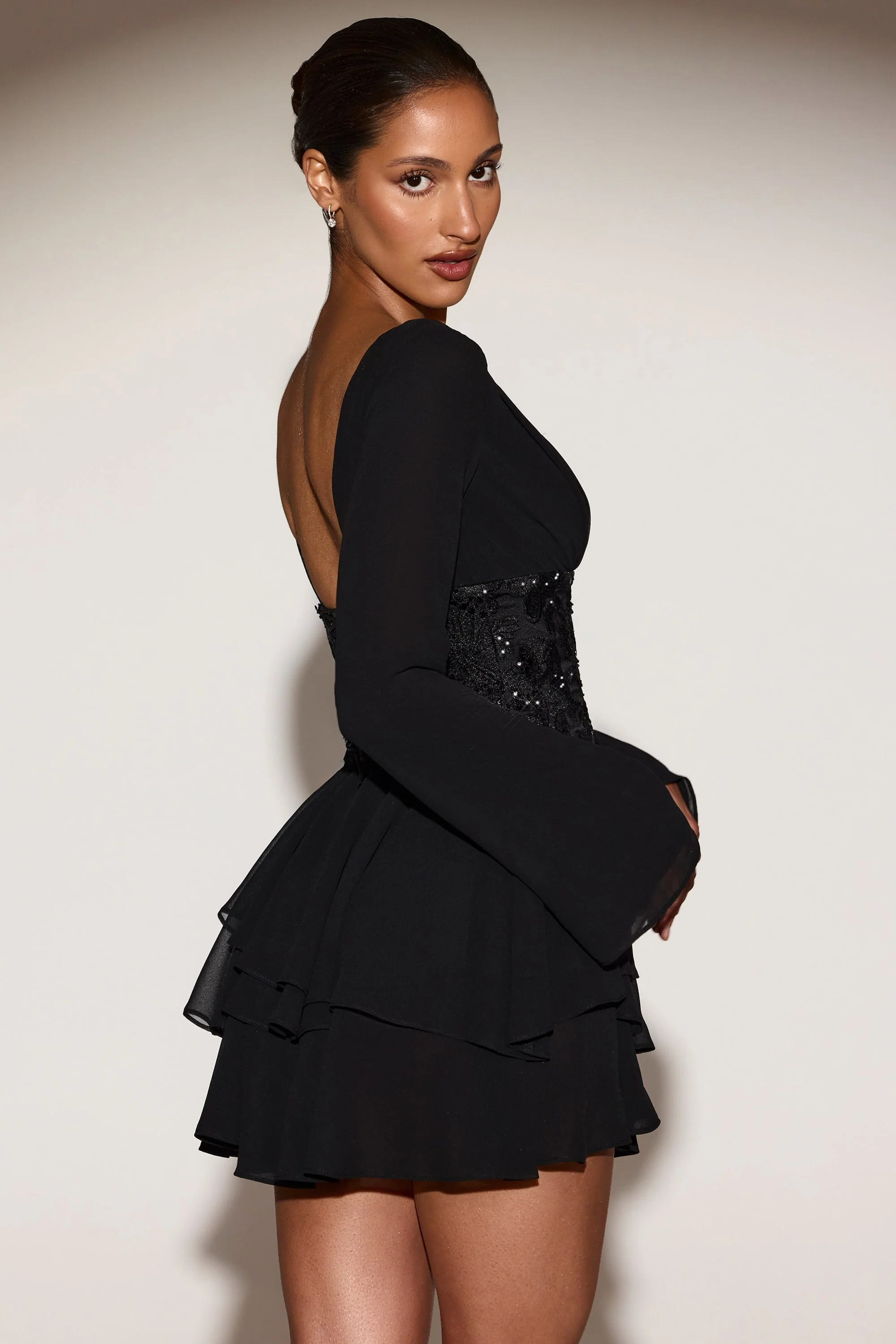Embellished Corset A-line Mini Dress in Black