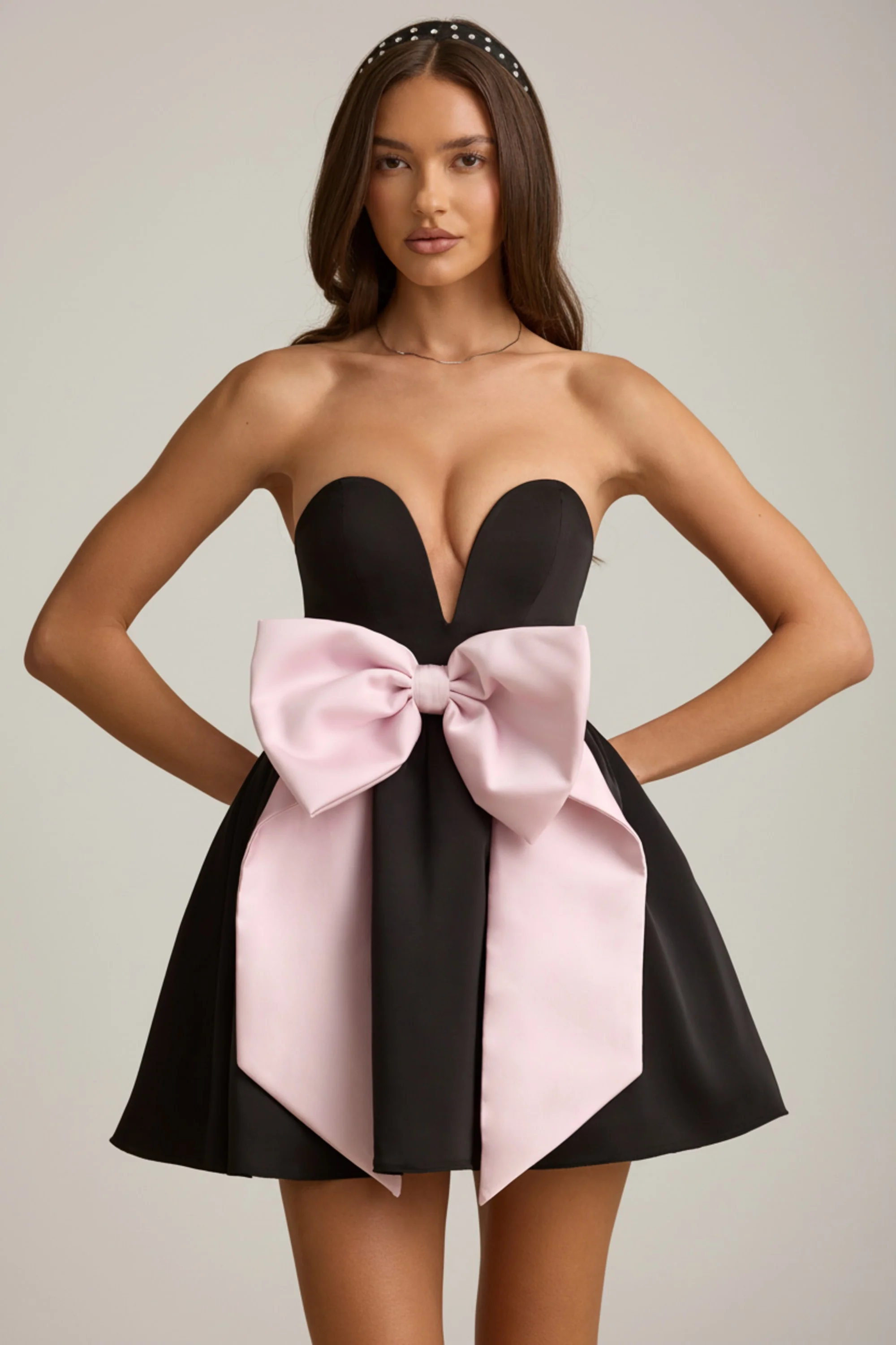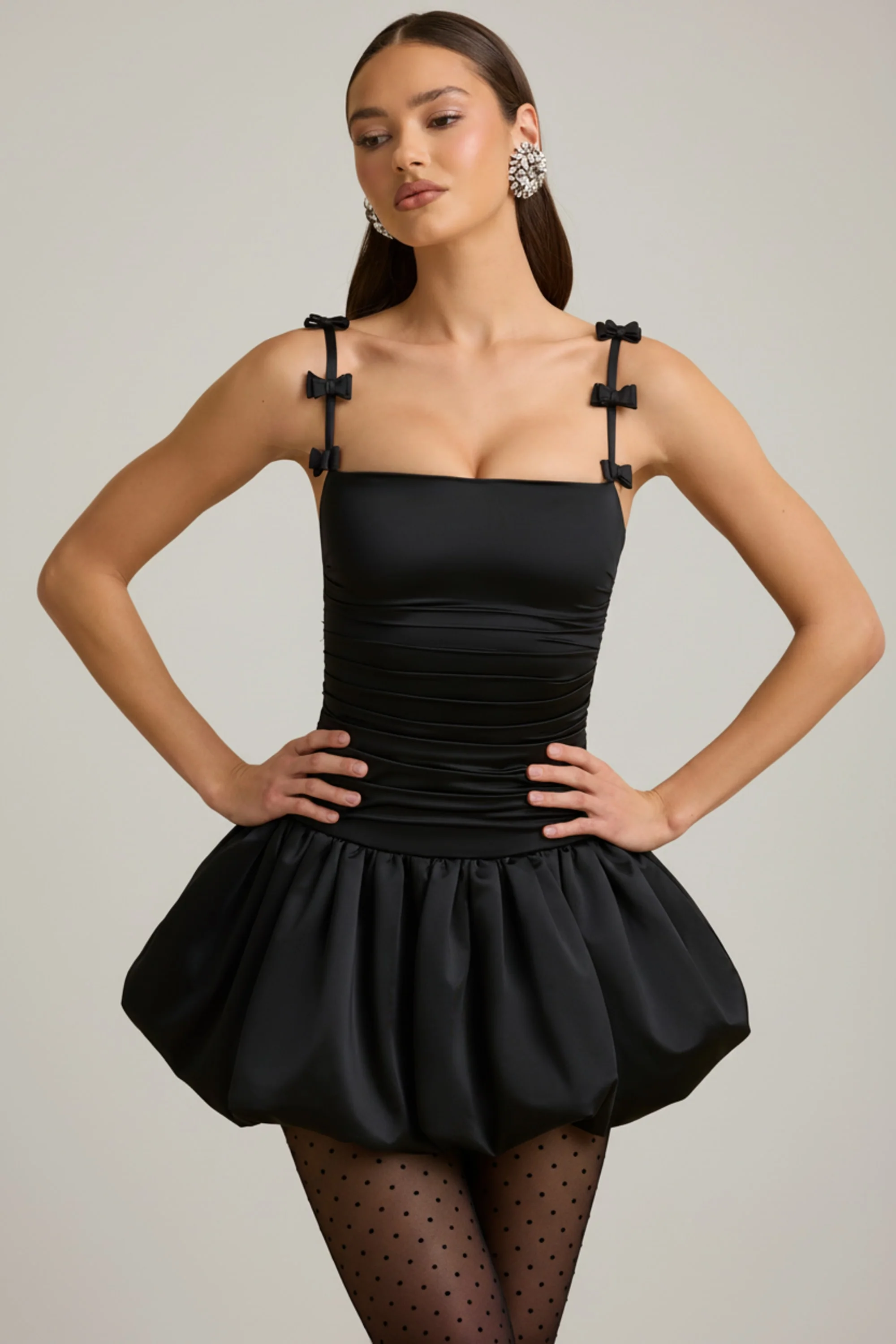 Bow-Detail Ruched Bubble Hem Mini Dress in Black