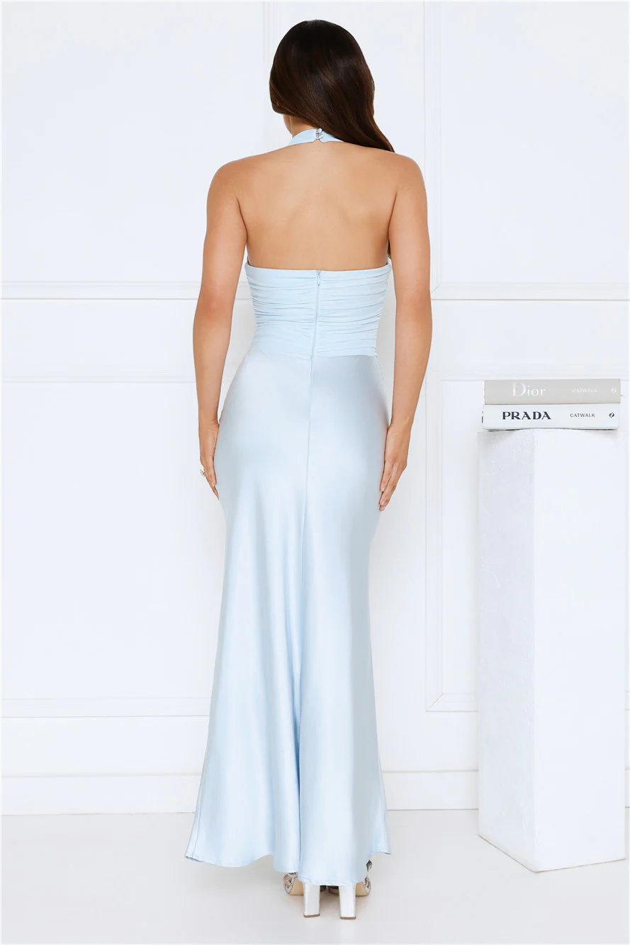 Petal Lane Mesh Satin Halter Maxi Dress Blue