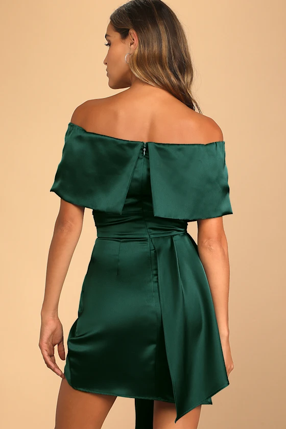 Always Celebrating Dark Green Satin Off-the-Shoulder Mini Dress