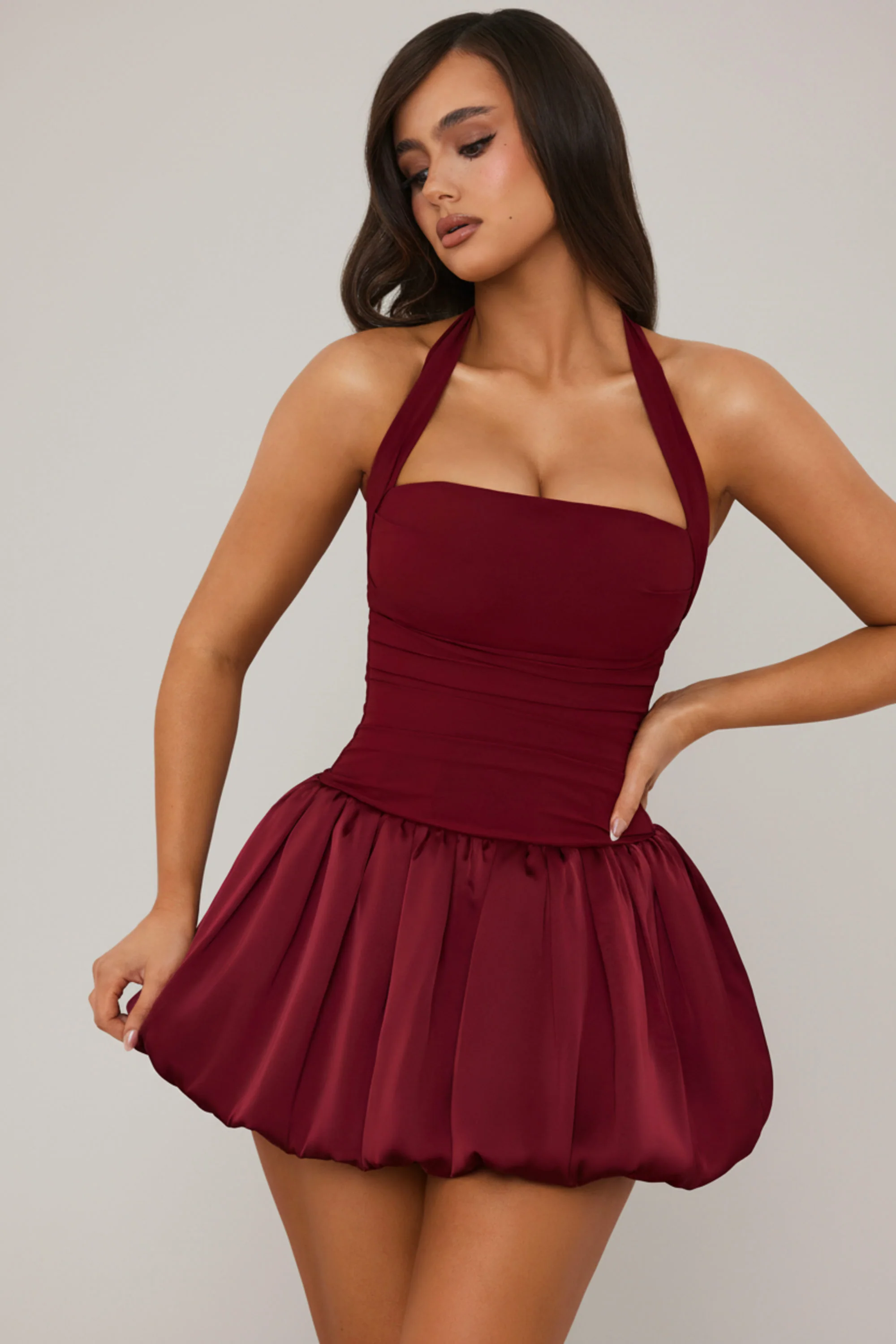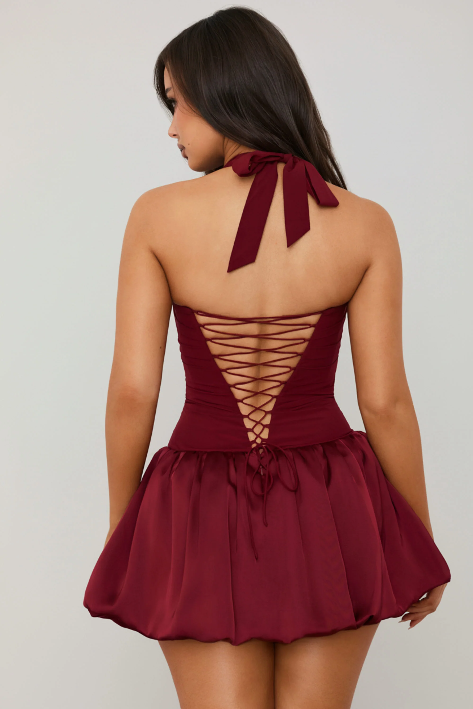 Halterneck Lace-Up Bubble Hem Corset Micro Mini Dress in Berry Red