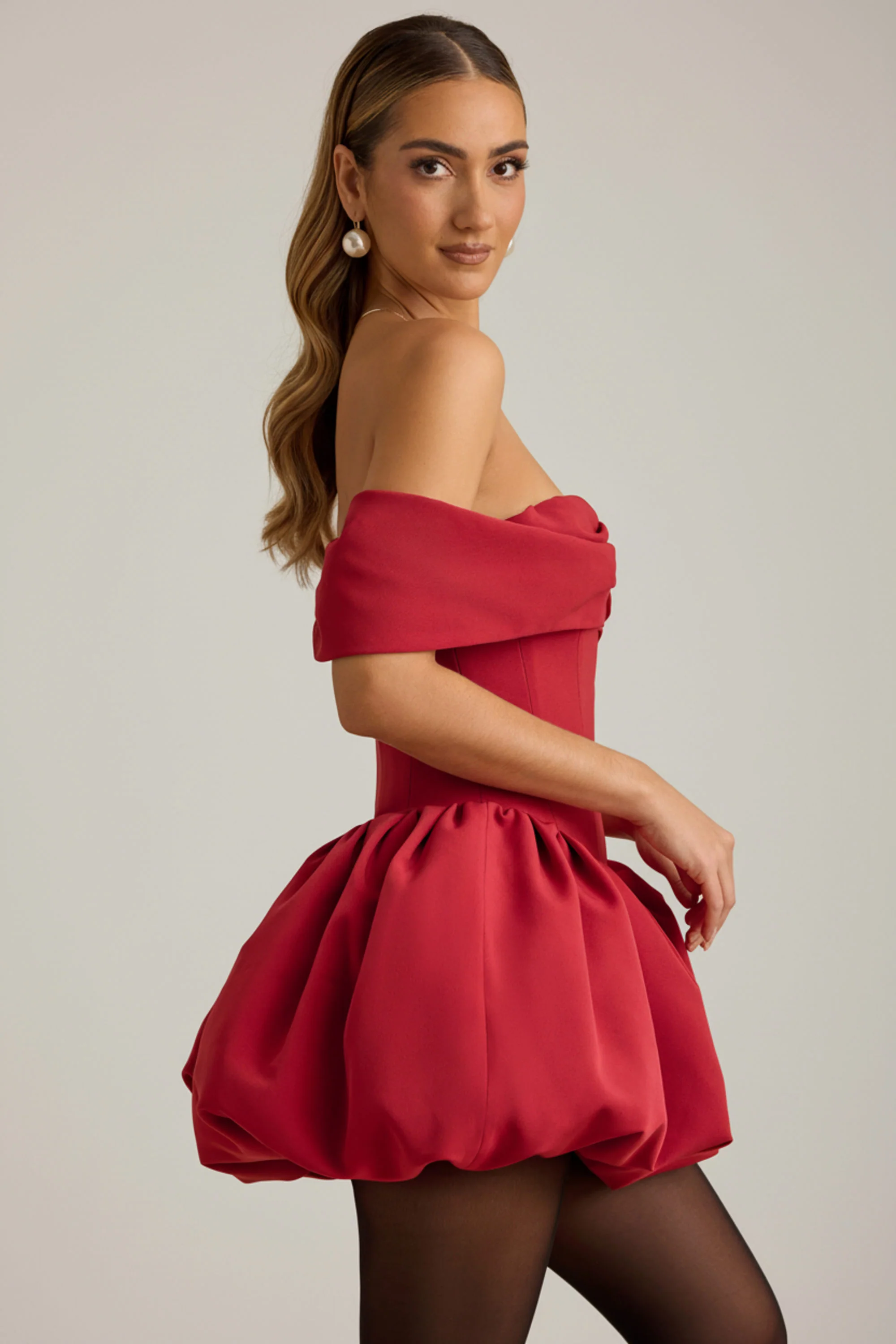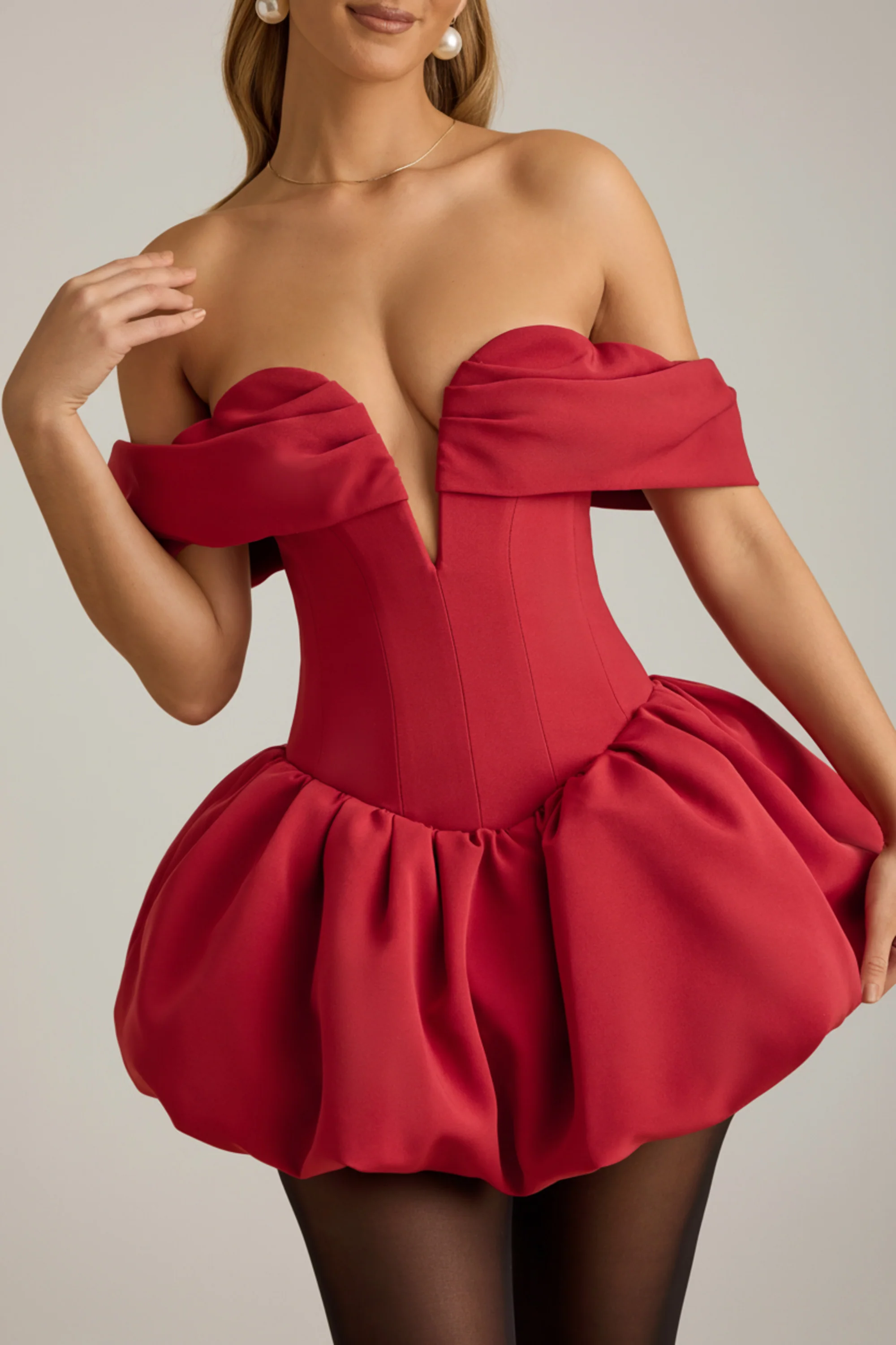 Off-Shoulder Layered Bubble Hem Corset Mini Dress in True Red