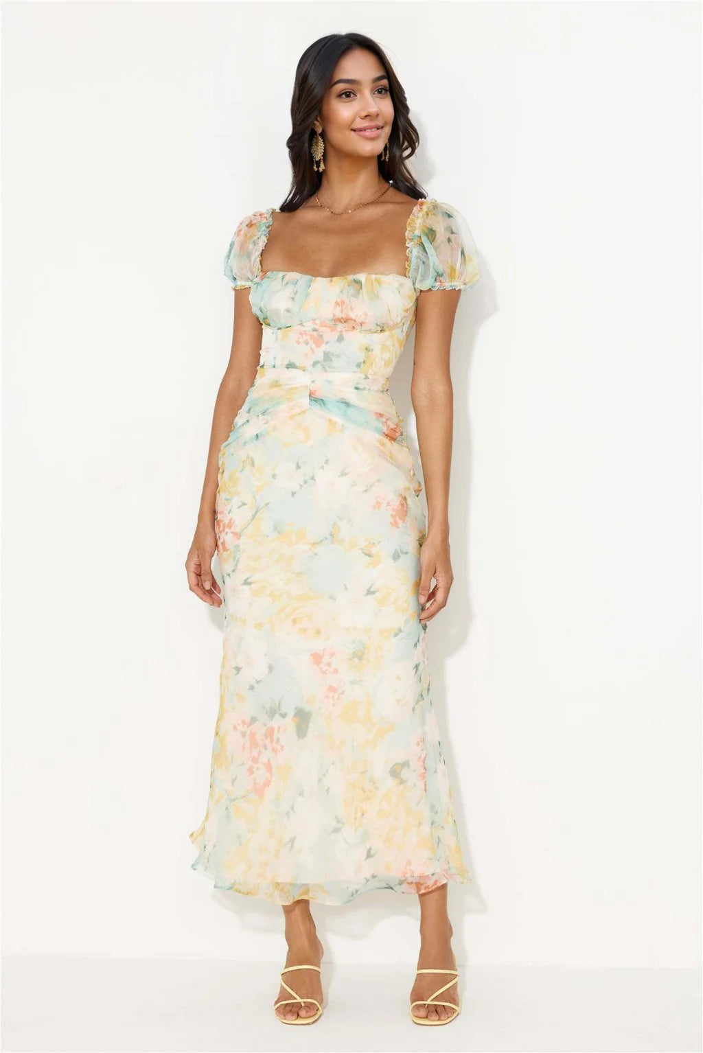 Lorma Midi Dress - Ruched Layered Dress in Pink Floral
