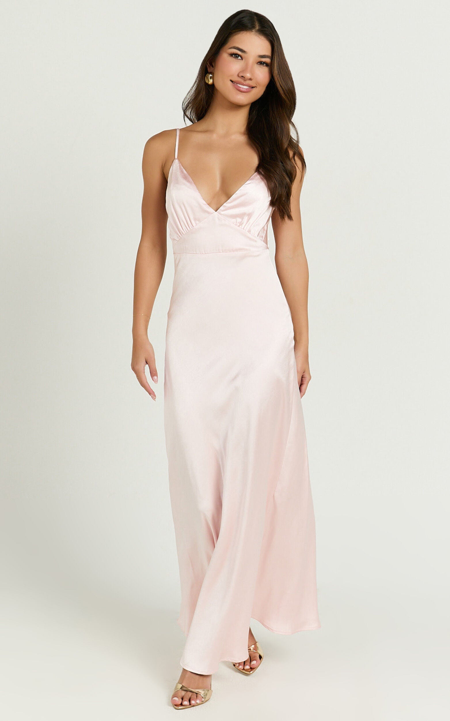 Lorenzia Maxi Dress - Plunge Corset Underbust Detail Satin Dress in Light Pink