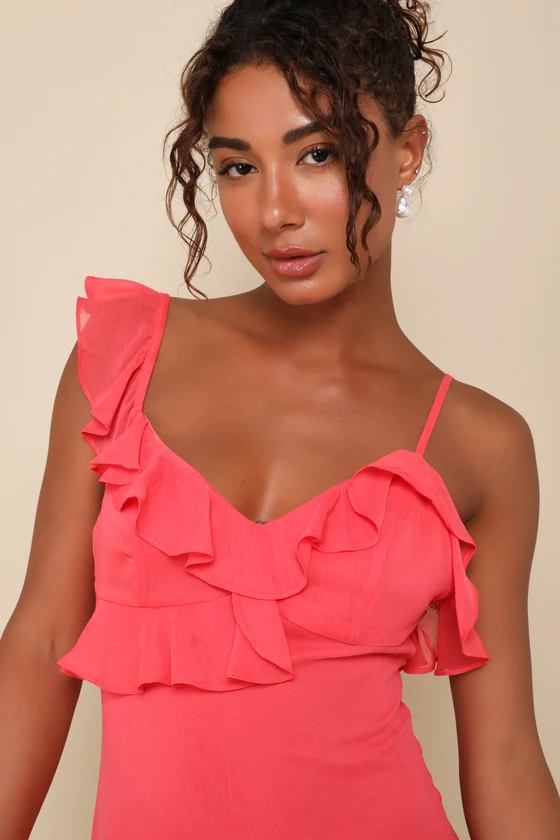 Captivating Always Coral Pink Ruffled Asymmetrical Mini Dress