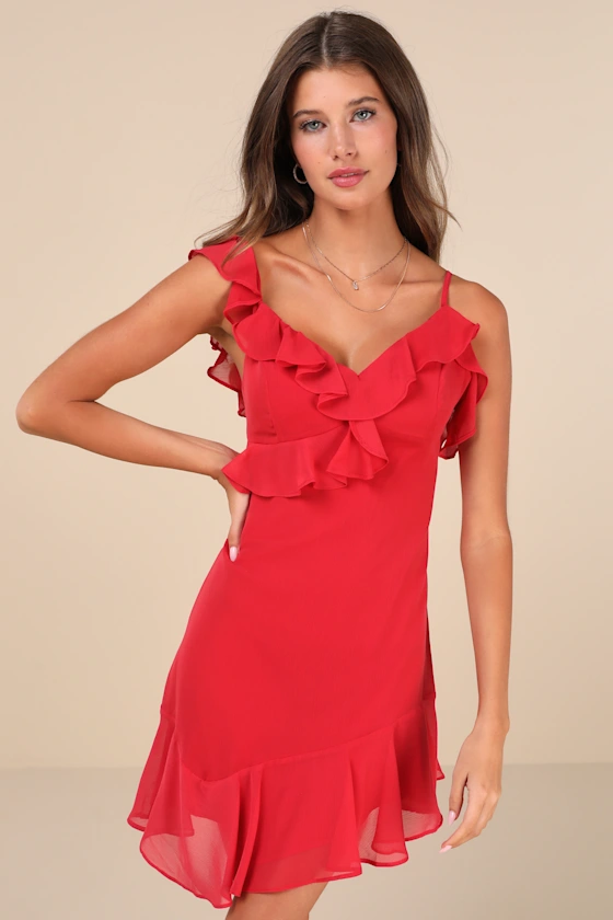 Captivating Always Red Ruffled Asymmetrical Mini Dress