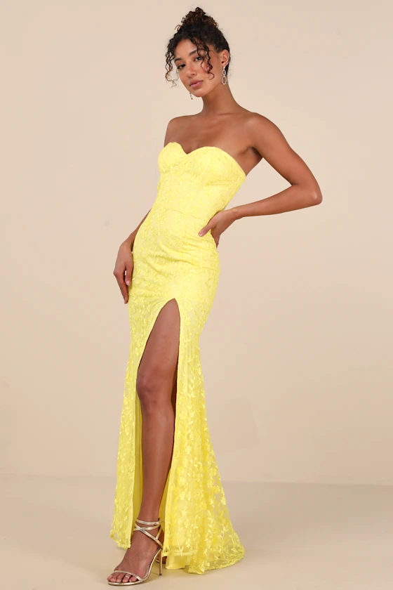 Romantic Beauty Yellow Floral Embroidered Strapless Maxi Dress