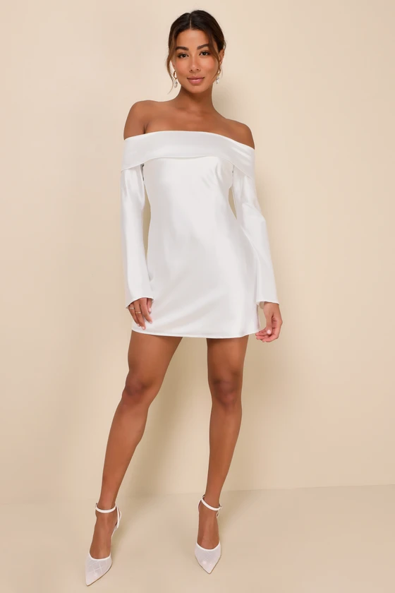 Luxurious Vision White Satin Off-the-Shoulder Mini Dress