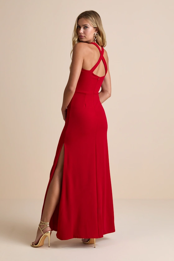 Perfectly Demure Red Backless Column Maxi Dress