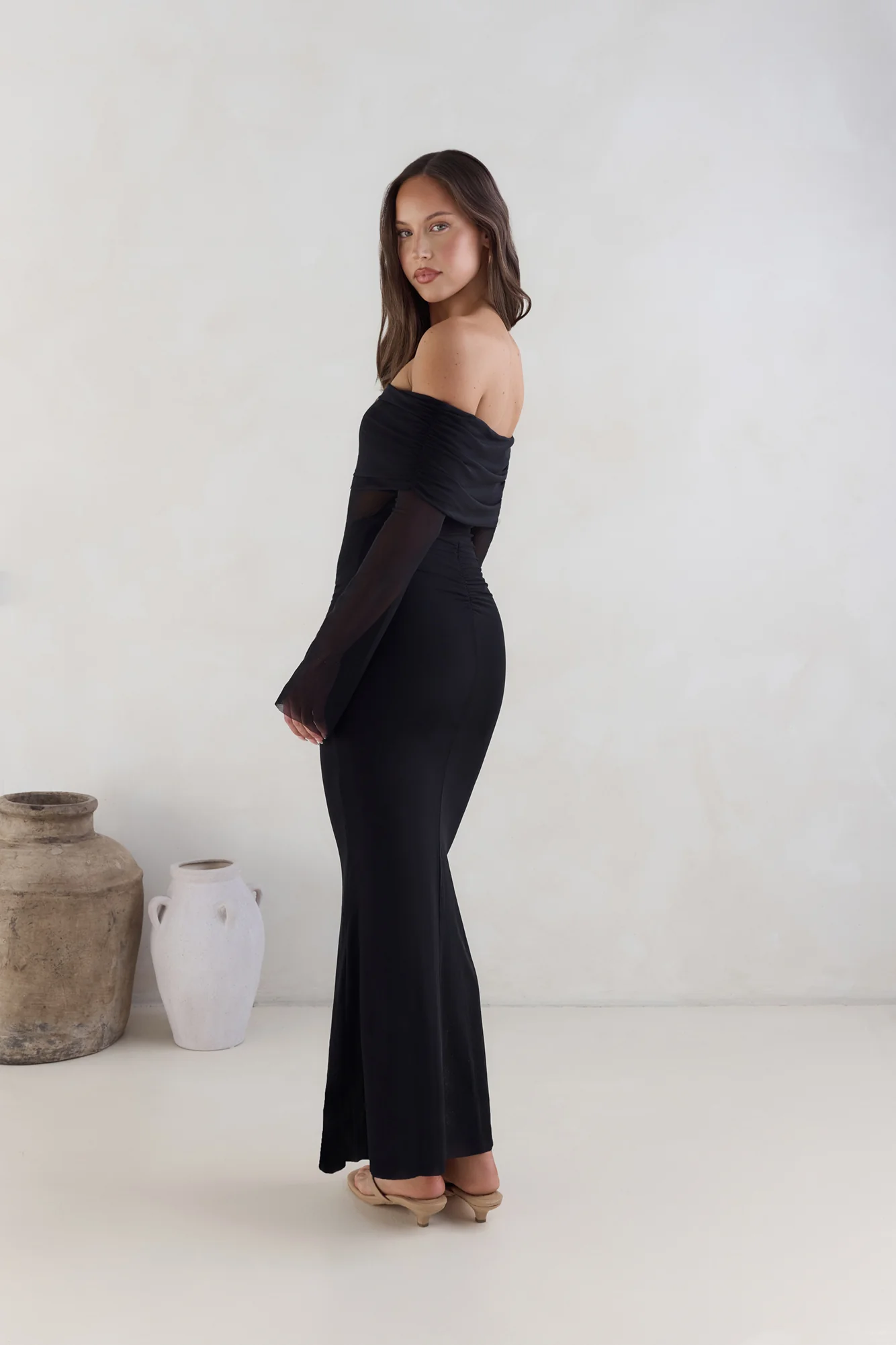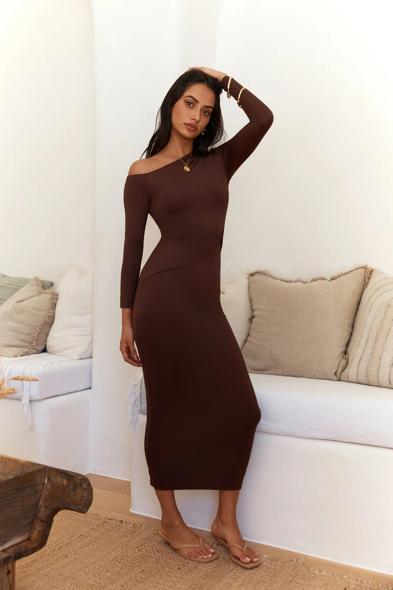 Horizon Luxe Off Shoulder Maxi Dress Coffee