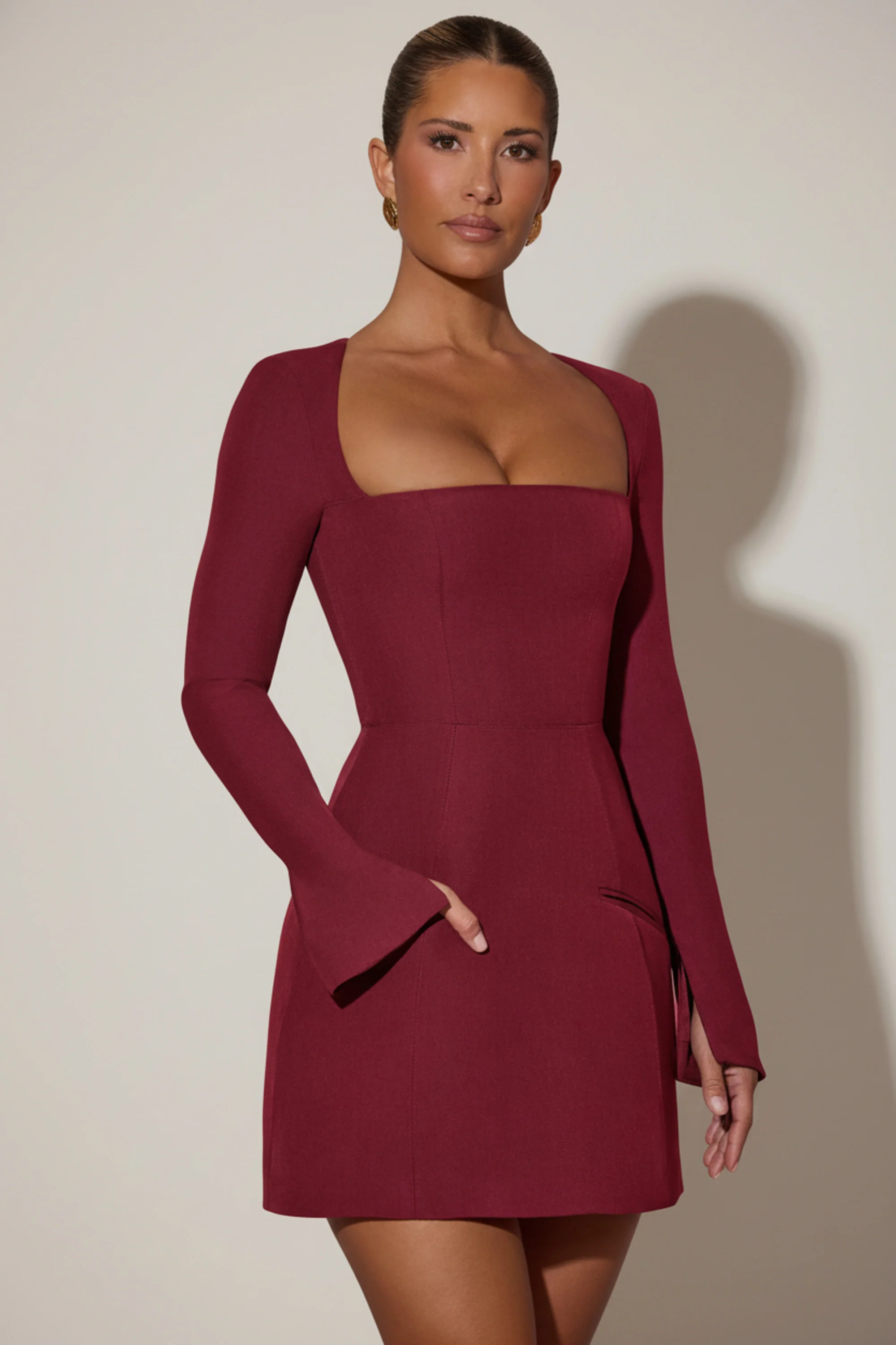 Square-Neck Structured Tulip Mini Dress in Wine Red